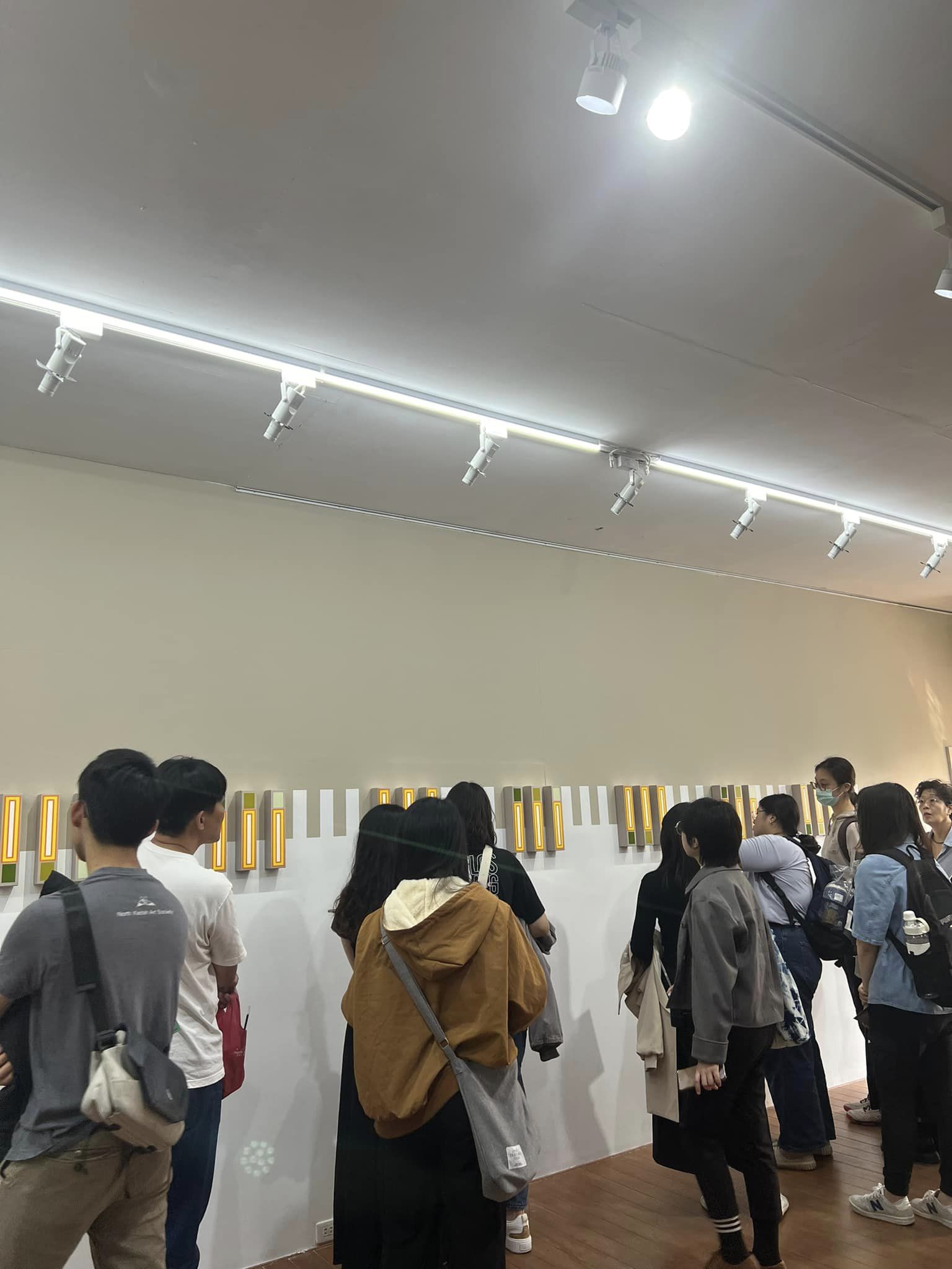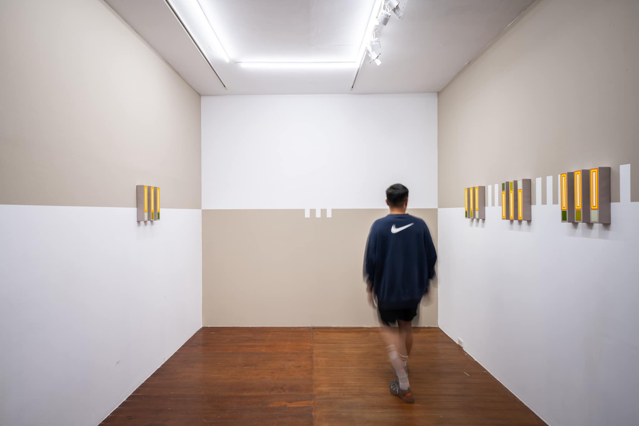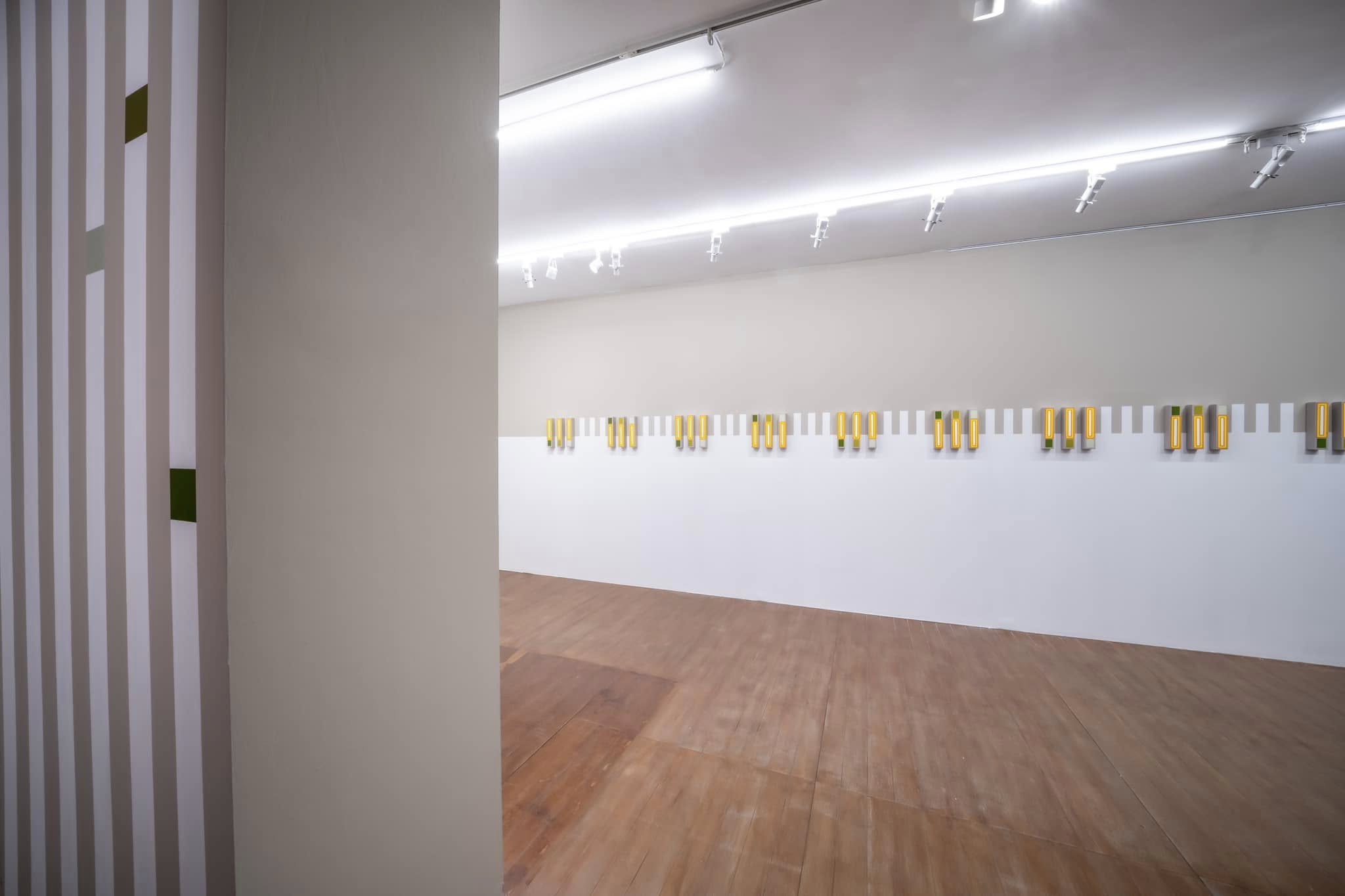 This exhibition features two painting installations, Intersection of Sight and Line of Sight Extension, which utilize both canvas and wall painting. They create a theatrical mode within the exhibition space. Within my pre-defined color scheme, the viewer encounters a color logic that feels both familiar and unfamiliar. Departing from the strong color contrasts of my previous works, this time I have chosen to work primarily with green and brown tones that resonate with the exhibition space. I extracted color blocks corresponding to those predominantly used in the surrounding environment and rearranged them within the picture plane, thereby deconstructing and forming new visual symbols.