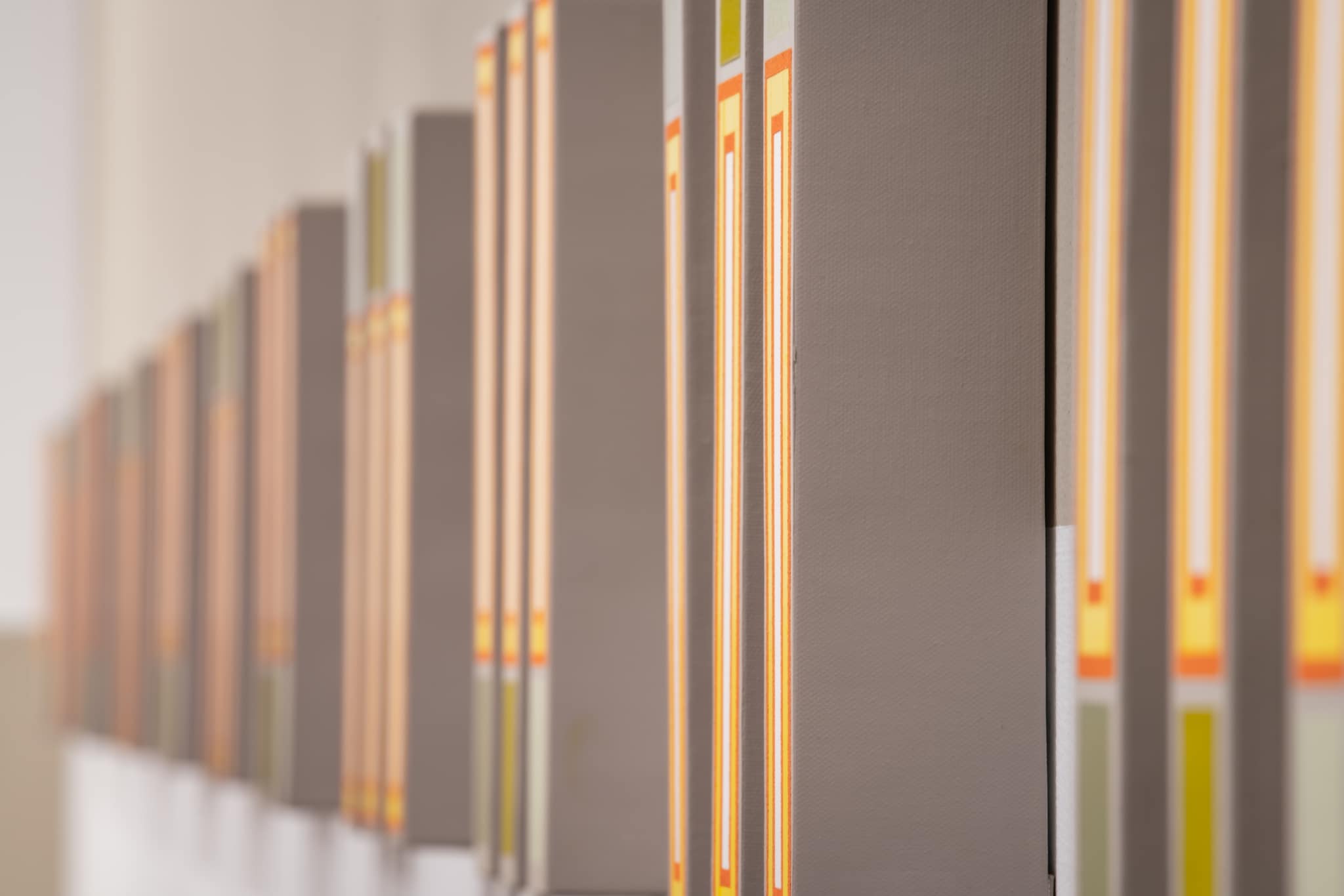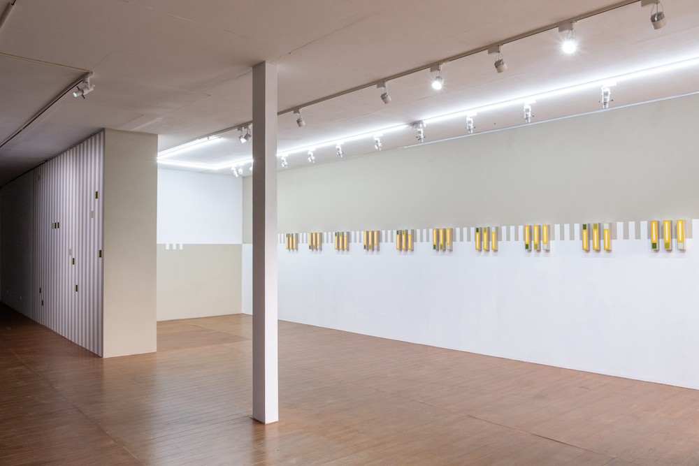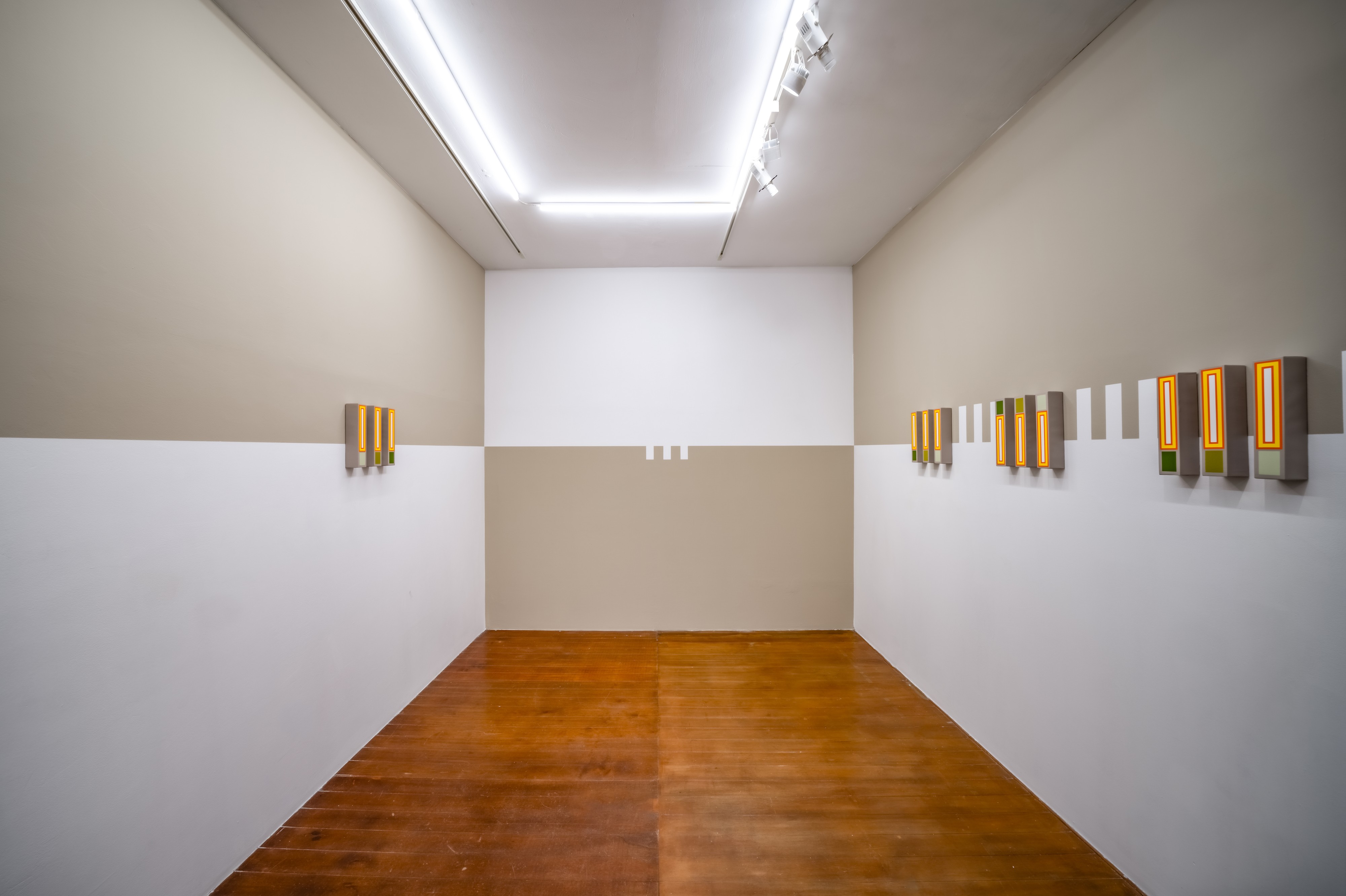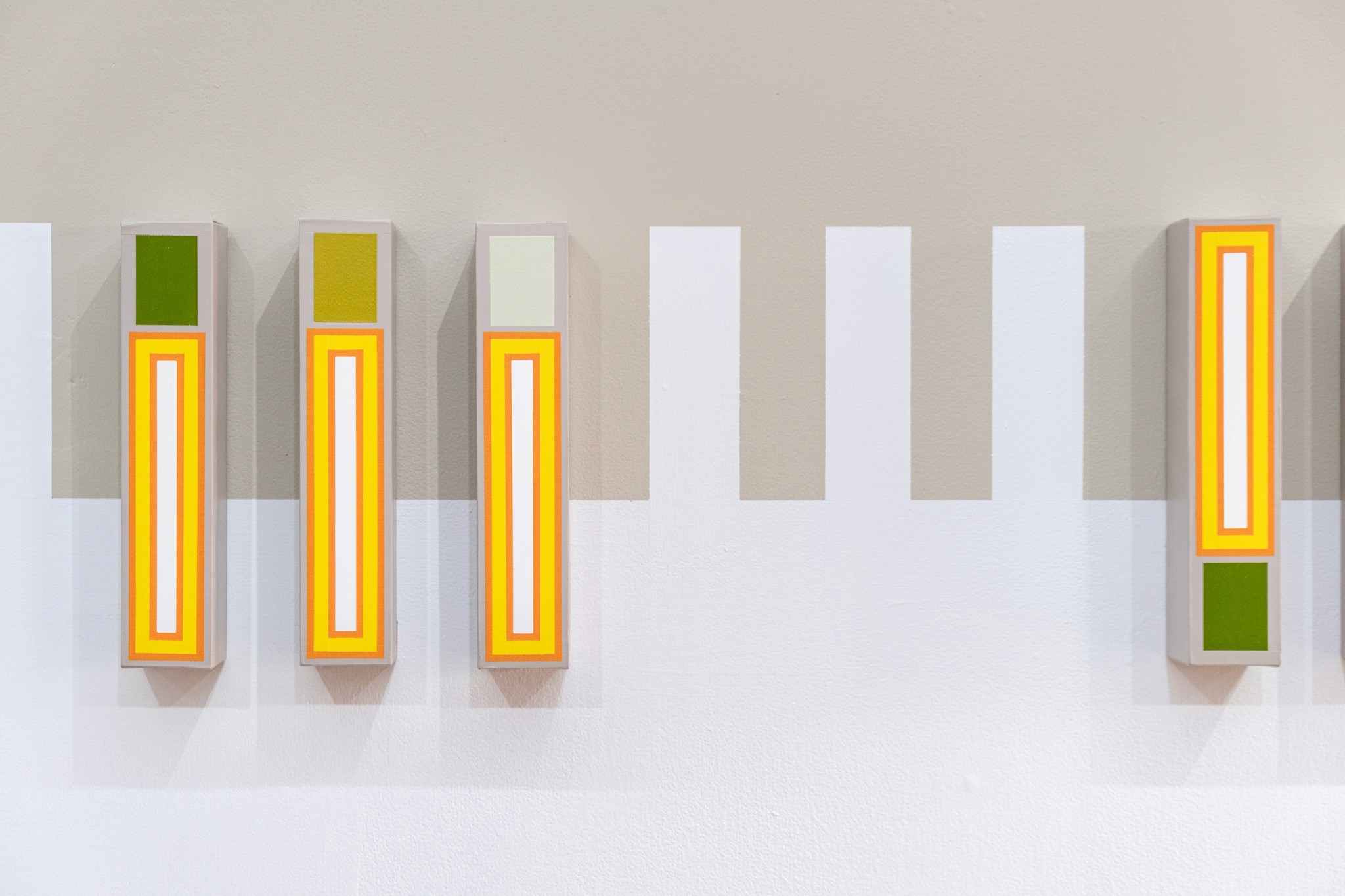 This exhibition features two painting installations, Intersection of Sight and Line of Sight Extension, which utilize both canvas and wall painting. They create a theatrical mode within the exhibition space. Within my pre-defined color scheme, the viewer encounters a color logic that feels both familiar and unfamiliar. Departing from the strong color contrasts of my previous works, this time I have chosen to work primarily with green and brown tones that resonate with the exhibition space. I extracted color blocks corresponding to those predominantly used in the surrounding environment and rearranged them within the picture plane, thereby deconstructing and forming new visual symbols.